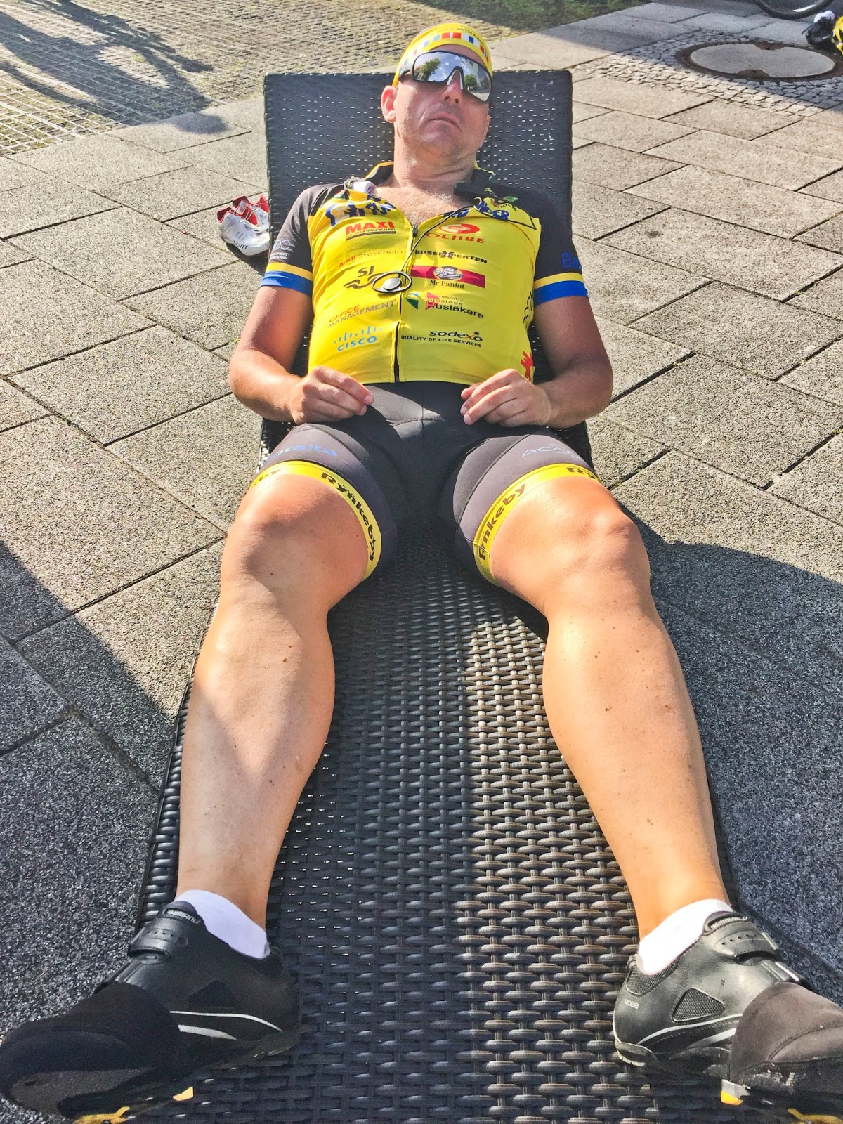 Men det räckte inte. Då utmanade Jörgen alla i teamet att raka benen, som cyklister ska göra. För varje teammedlem som rakade benen skänkte Jörgen 1000 kr till vår teamkassa. Han fick ihop 15000 kr som han skänkte till lagkassan. Tack Jörgen, respekt fan, respekt, som vi tonåringar säger.